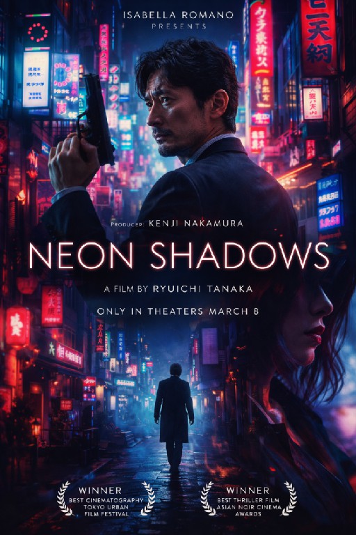 Neon Shadows is a stylish neo-noir crime thriller set in the vibrant nightlife of Tokyo. The film follows a detective drawn into a dangerous web of corruption, betrayal, and hidden identities.